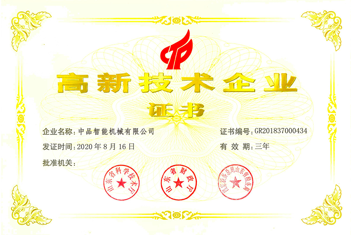 中品智能機械高新技術企業(yè)認證